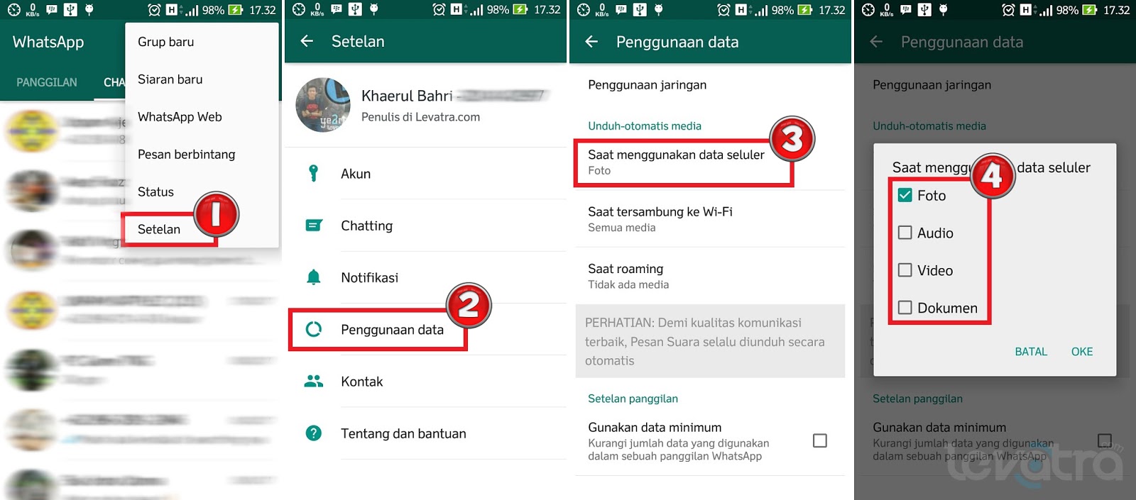 Selanjutnya yaitu mematikan fitur auto-download aplikasi chatting seperti Whats App dan Blackberry Messenger. Fitur auto-download ini adalah fitur yang disediakan oleh aplikasi chatting agar penggunanya tidak perlu lagi men-download file seperti gambar secara manual. Fitur ini sangat jarang diperhatikan oleh pengguna karena merasa bermanfaat.